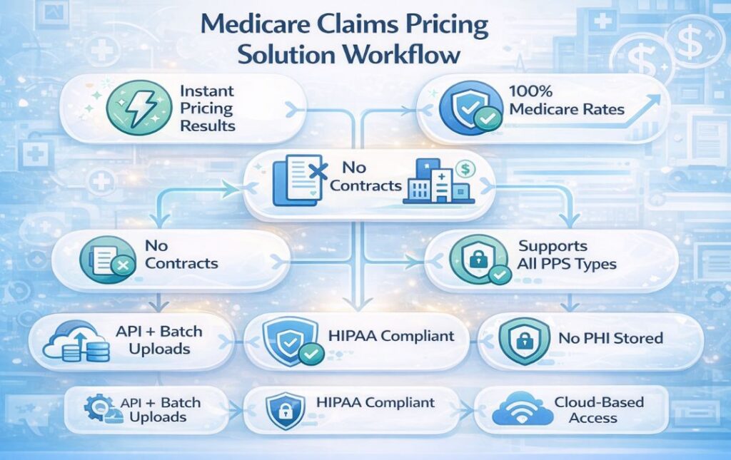 CMSPricer is a web-based Medicare claims pricing tool that returns results in seconds, priced at 100% of Medicare rates. There’s no waiting, no chasing down a sales representative, and no getting locked into a long-term contract. You pre-pay, use the platform, and get accurate pricing. That’s the entire process.